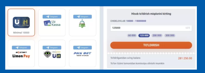| Валюты | UZS, USD, EUR, RUB, KZT и т.д. |